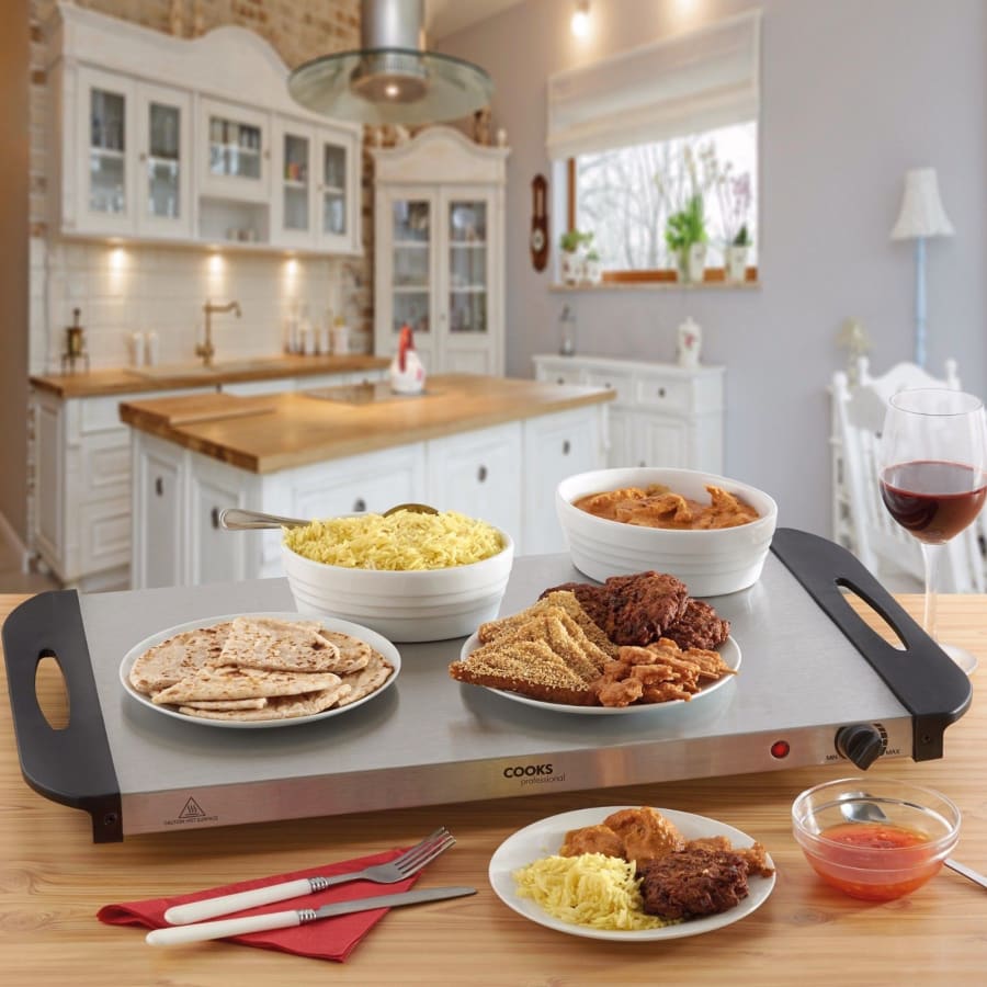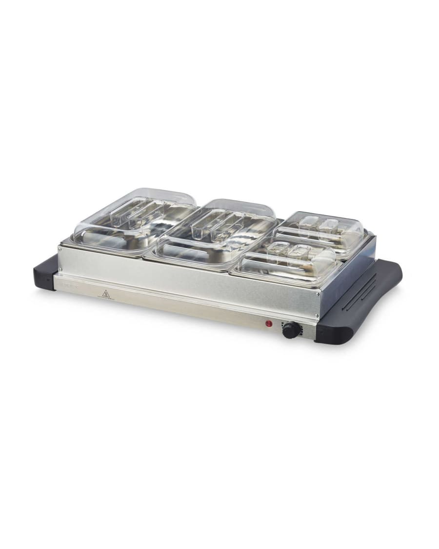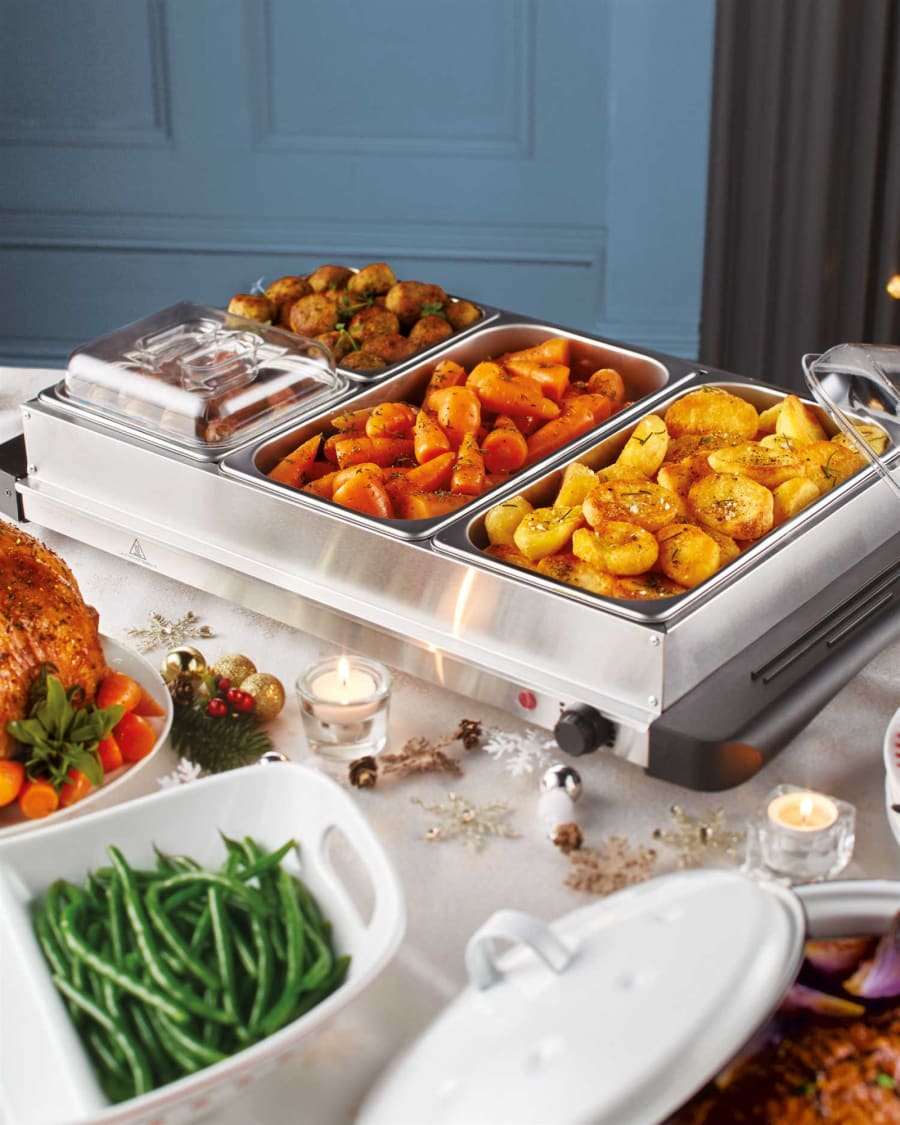 Serve up a feast in style with this professional four-section buffet warmer. Keep family and friends supplied with hot food in this stylish buffet warmer, ideal for a variety of meals. It comes with the ability to store up to four separate meals from meats, vegetables and curries to soups and side dishes. The sections also remove allowing it to also transform into a flat hotplate giving you more options in what meals you wish to serve. This all-in-one buffet warmer is a must for any entertaining.