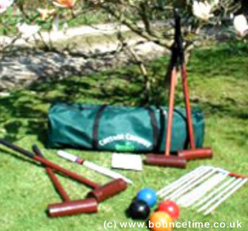 This small sized set is ideal for the small or large garden's and perfect for adult beginners, children and general family play. The 4 hardwood mallets are 32.5 inches long with slightly smaller than standard heads. The set contains 4 full sized but slightly light weight balls to match the mallets, and 6 steel hoops, a hardwood winning post, and a set of rules. Great Fun for all Kids or Adults !!!!!