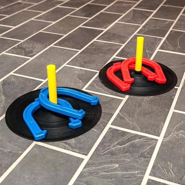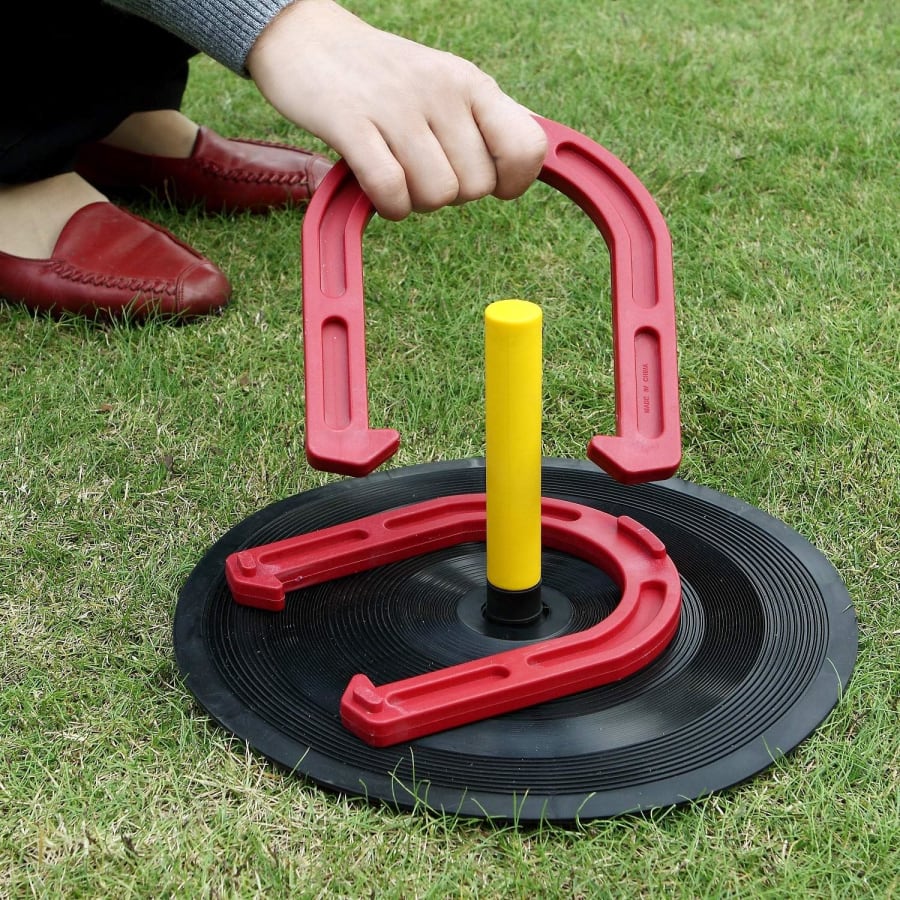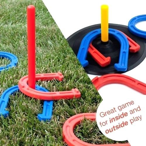 The Giant Rubber Horseshoes Toss Game is a great classic game for adults and kids alike!Horseshoes is the perfect activity for a backyard barbeque, a family reunion, camping trips, picnics and more. It will give your family years of enjoyment., the rubber design makes it safe for children to use as they learn proper throwing techniques.