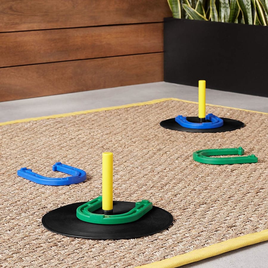 CONTENTS--4 horse shoes 2 each of green and blue, 2 yellow indoor stakes and rubber mats to hold the stakes, 2 red stakes for outdoor play in soft ground